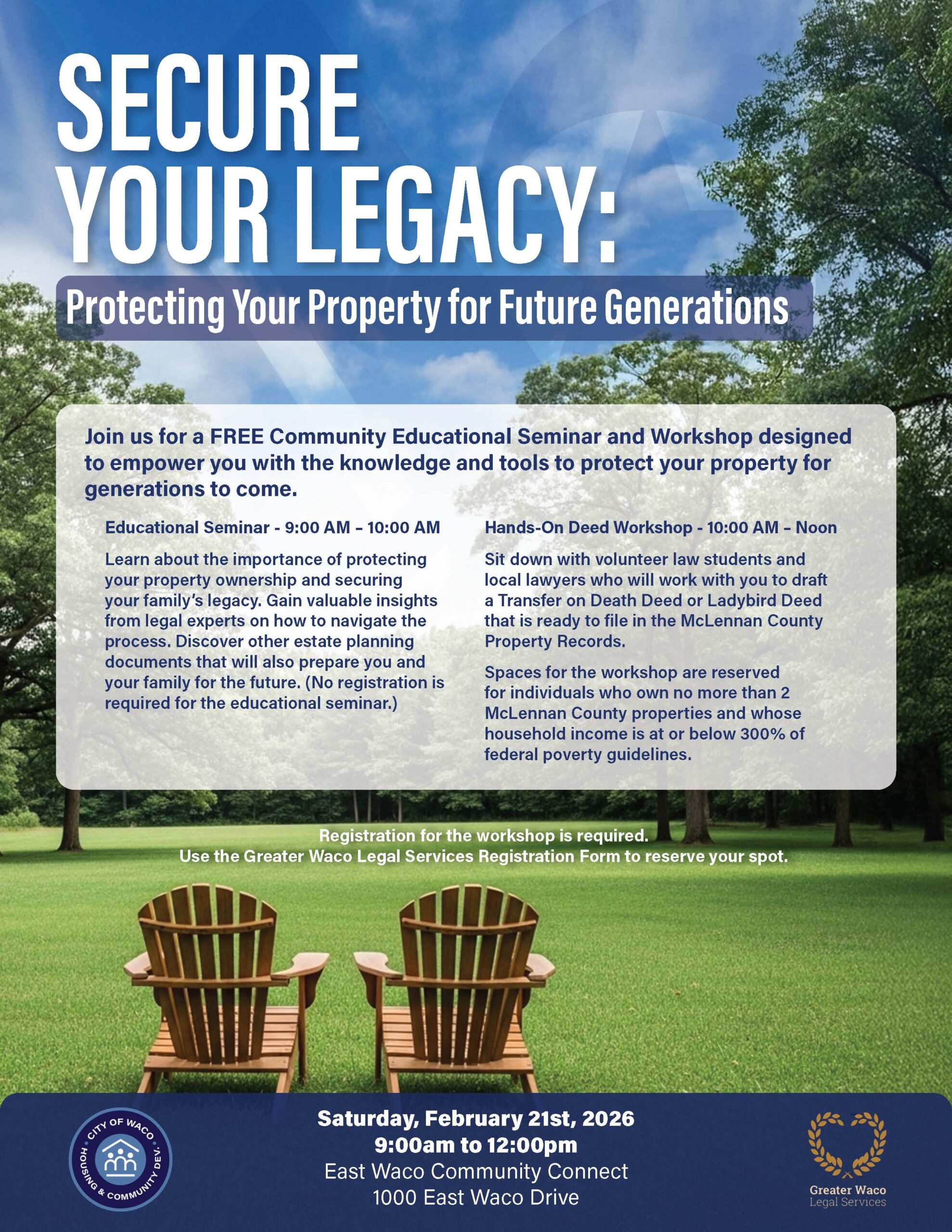 Secure Your Legacy: Protecting Your Property for Future Generations + Add to Google Calendar + iCal / Outlook export Date Feb 21 2026 Expired! Time 9:00 am - 12:00 pm More Info Register Location East Waco Community Connect 1000 East Waco Drive, Waco, TX Category Community Event Share this event SearchSearchRecent PostsAARP Free Income Tax Preparation A Young Heart with Big Dreams Turns Toward Homeownership Building Stronger Communities Together Pam Rogers Shows That It’s Never Too Late to Start Again NeighborWorks Waco Announces Karen Saucedo as Vice President and Chief Financial Officer Recent CommentsNo comments to show.
